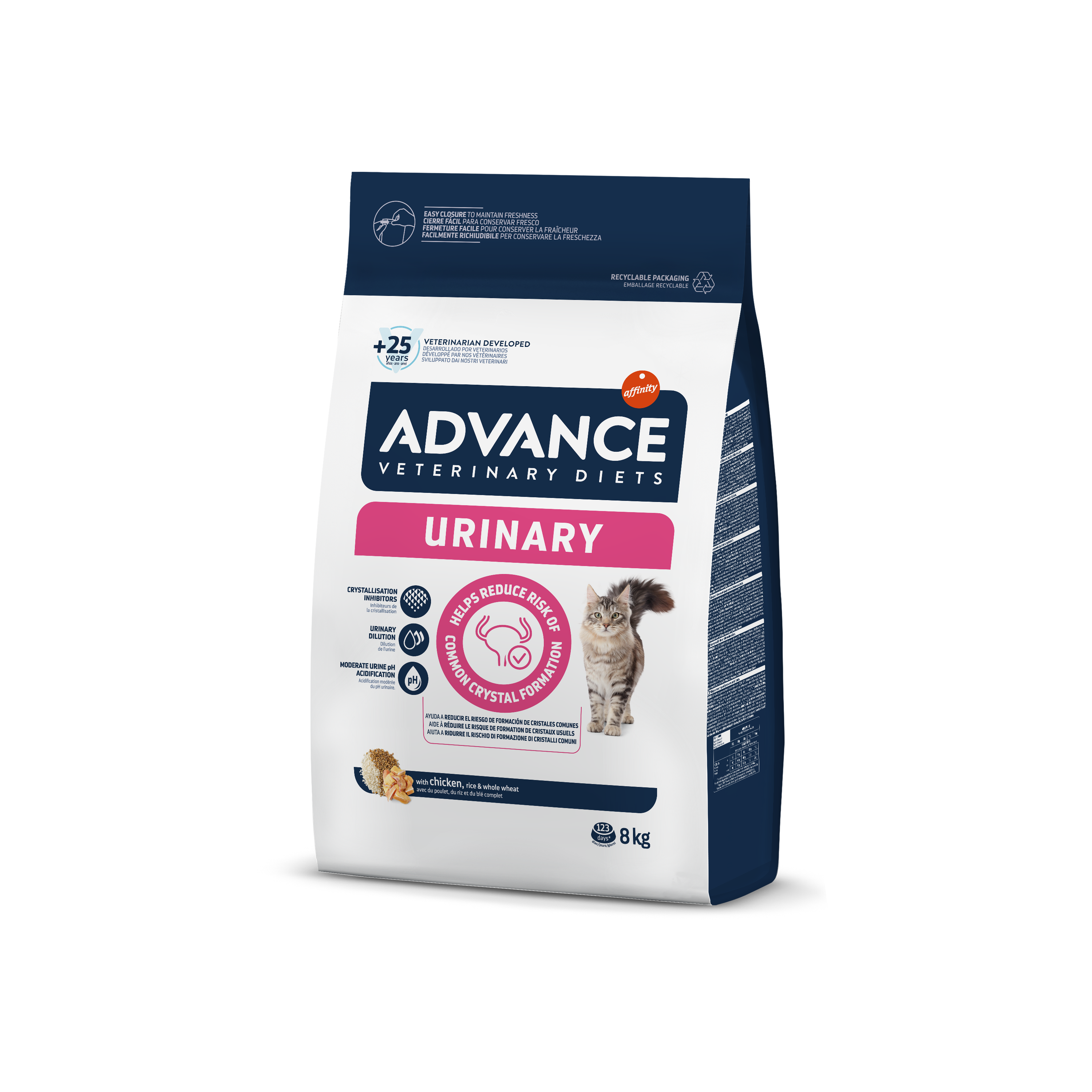 „Advance Veterinary Diets URINARY“ yra visavertis subalansuotas dietinis kačių pašaras, skirtas suaugusioms katėms struvitinių akmen ų pakartotiniam atsiradimui mažinti. Šlapimą rūgštinančios savybės ir mažas magnio kiekis padeda tirpdyti struvitinius akmenis ir stabdo struvitinių akmenų atsinaujinimą.